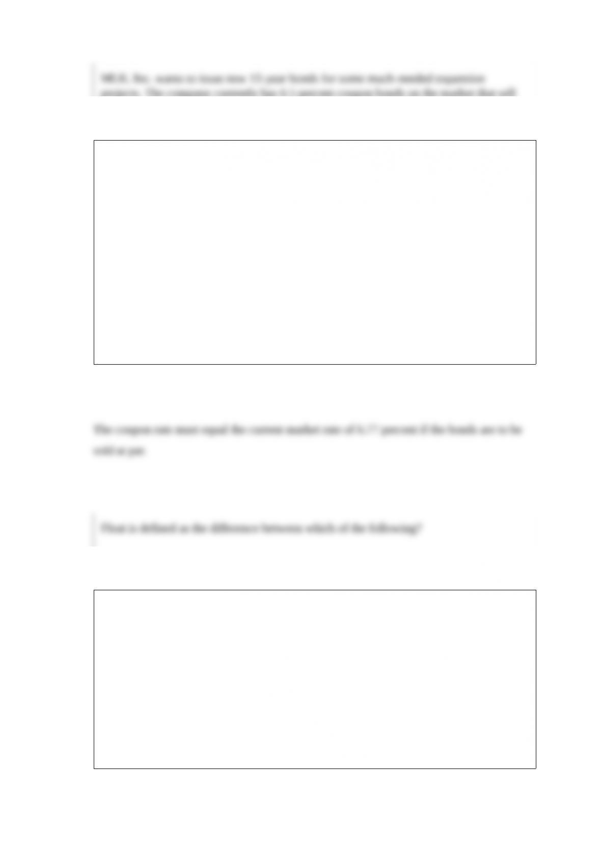 RAK Co. wants to issue new 20-year bonds for some...get 1 The company currently has 6 percent coupon bonds on the market that sell for $1,055, make semiannual payments, and mature in 20 years. What coupon rate should the company set on its new bonds if it wants them to sell at par? (Do not round intermediate calculations and enter your answer as a percent rounded to 2 decimal places, e.g., 32.16.) Quiz 6 PDF - 1.BDJ Co. wants to issue new 21-year bonds for... What coupon rate should the company set on its new bonds if it wants them to sell at par? (Do not round intermediate calculations and enter your answer as a percent rounded to 2 decimal places, e.g., 32.16.) Coupon rate 7 .8 2 ± 1 .0 % % Explanation: The company should set the coupon rate on its new bonds equal to the required return of the ... Airbutus Co. wants to issue new 20-year bonds for some much- needed ... Airbutus Co. wants to issue new 20-year bonds for some much- needed expansion projects. The company currently has 8% coupon bonds on the market that sell for $930, make semiannual payments, and mature in 20 years. What coupon rate should the company set on its new bonds if it wants them to sell at par? MavRay is waiting for your help. Business Finance Ch6 Quiz - Connect Flashcards | Quizlet Coupon payment = (1000 x 7.9%x50%) Coupon payment = 39.5 Number of periods = 13 x 2 Number of periods = 26 Periodic YTM = 5.6%/2 Periodic YTM = 2.8% Price = -PV (rate,nper,pmt,fv)) Price = -PV (2.8%,26,39.5,1000) Price = 1,210.40 You purchase a bond with an invoice price of $1,145.