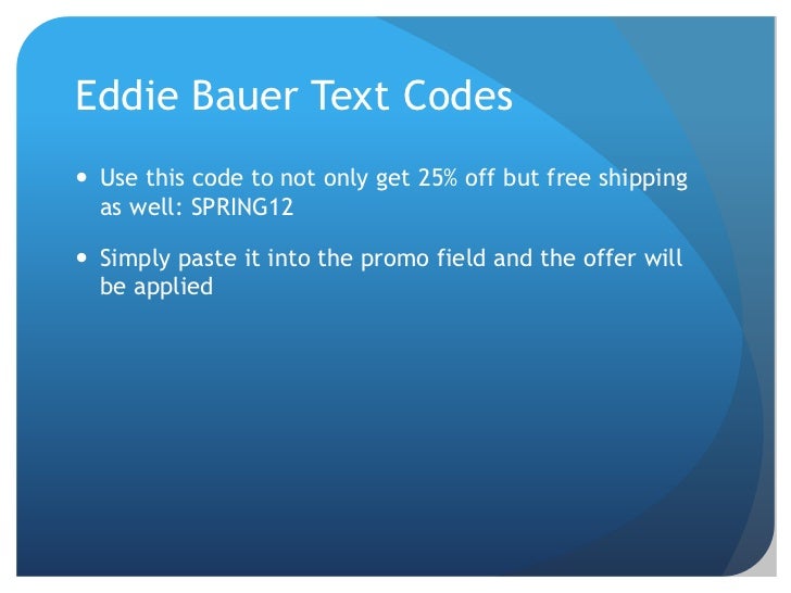 Eddie Bauer Coupons, Coupon Codes and Discounts Eddie Bauer Coupons, Coupon Codes and Discounts Check latest sales and clearance for Eddie Bauer store - CLICK HERE Eddie Bauer Price Drops, Offers, Promotions and Sales Check latest sales and clearance for Eddie Bauer store - CLICK HERE Snowboards.com Amazon.com TurboTax Verizon Wireless DAZ 3D Blair Biotherm Bath and Body Works Amazon.com