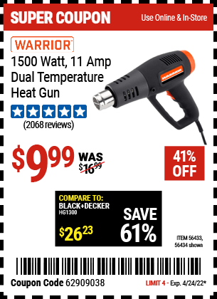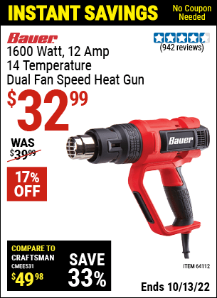 BAUER 14 Temperature Dual Fan Speed Heat Gun for $32.99 BAUER 14 Temperature Dual Fan Speed Heat Gun for $32.99 - Harbor Freight Coupons, GET NEW COUPONS, BAUER 14 Temperature Dual Fan Speed Heat Gun for $32.99, Buy the BAUER 14 Temperature Dual Fan Speed Heat Gun (Item 64112) for $32.99, valid through October 13, 2022. Compare our price of $32.99 to CRAFTSMAN at $49.98 (model number: CMEE531).