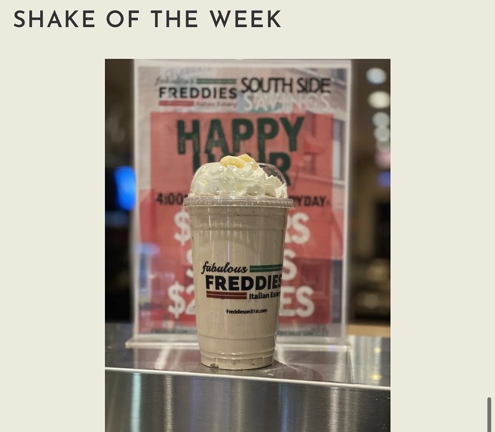 FreddiesOn31st - Your Go To Spot for Authentic Chicago Style Grub A Slice For Everyone Purchase Weekly Specials Slice of the Week Deep Dish Freddies Classic Sausage, Mushroom, Onion, and Green Pepper $4.50 Sandwich of the week BURGERITO Single Patty Burger on a Flour Tortilla with Everything plus American Cheese $6.50 Shake of the week Michigan Pothole Chocolate Ice Cream mixed with Fudge and Brownies $4.50